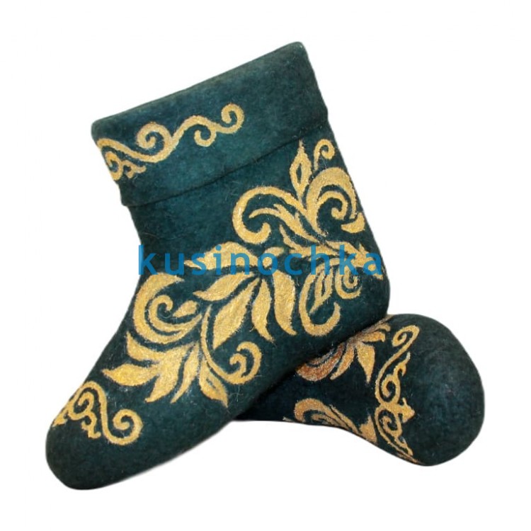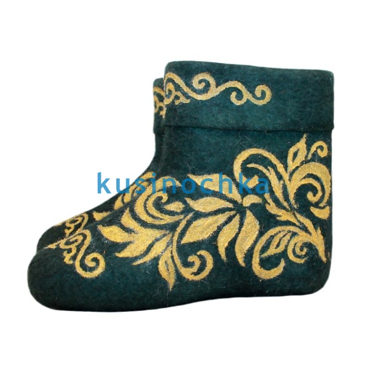 Полуваленки ручной валки на тёмно-зелёной основе, с золотым узором, нанесённым по передней поверхности и отворотам. Рисунок — абстрактный или стилизованный (завитки, ветви, геометрические повторы), выполненный акриловой краской с матовым золотистым пигментом (не блёстками, без излишнего блеска — скорее, тёплый, природный отсвет).