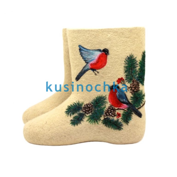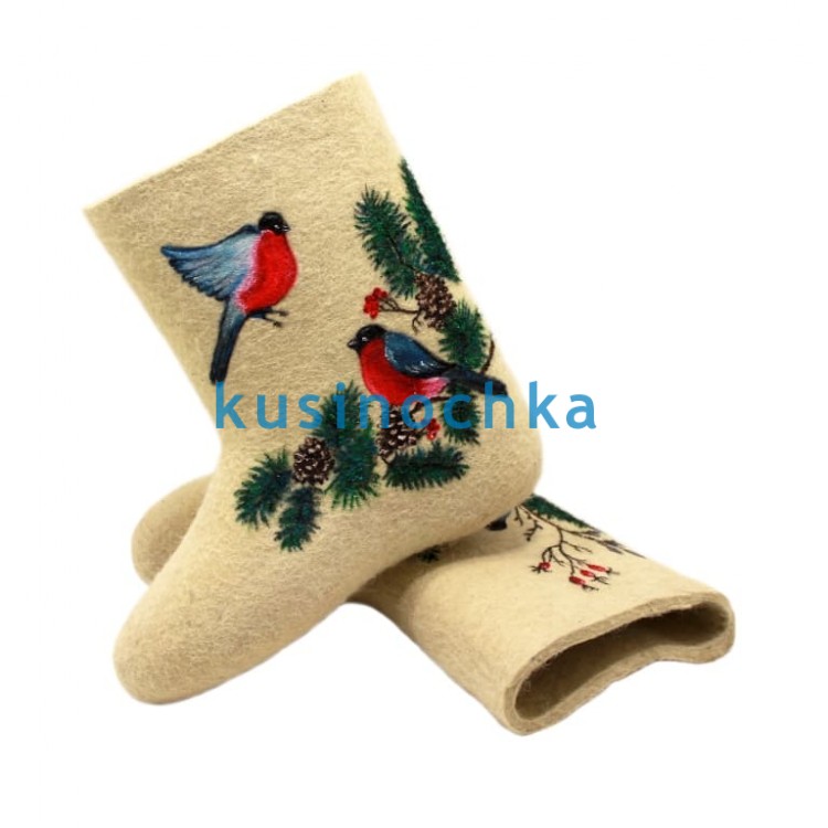 Полуваленки ручной валки на светлой основе, с художественным рисунком: один снегирь прилетает, второй — сидит на еловой ветке, слегка склонив голову. Сцена передаёт движение и связь — без пафоса, в лёгкой, графичной манере.