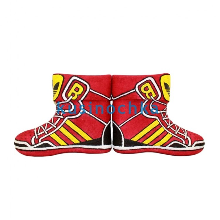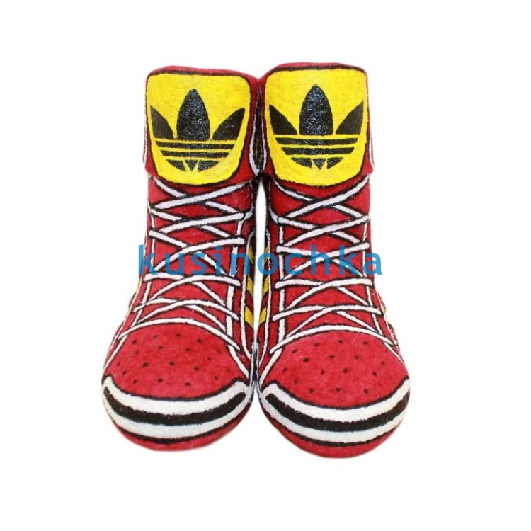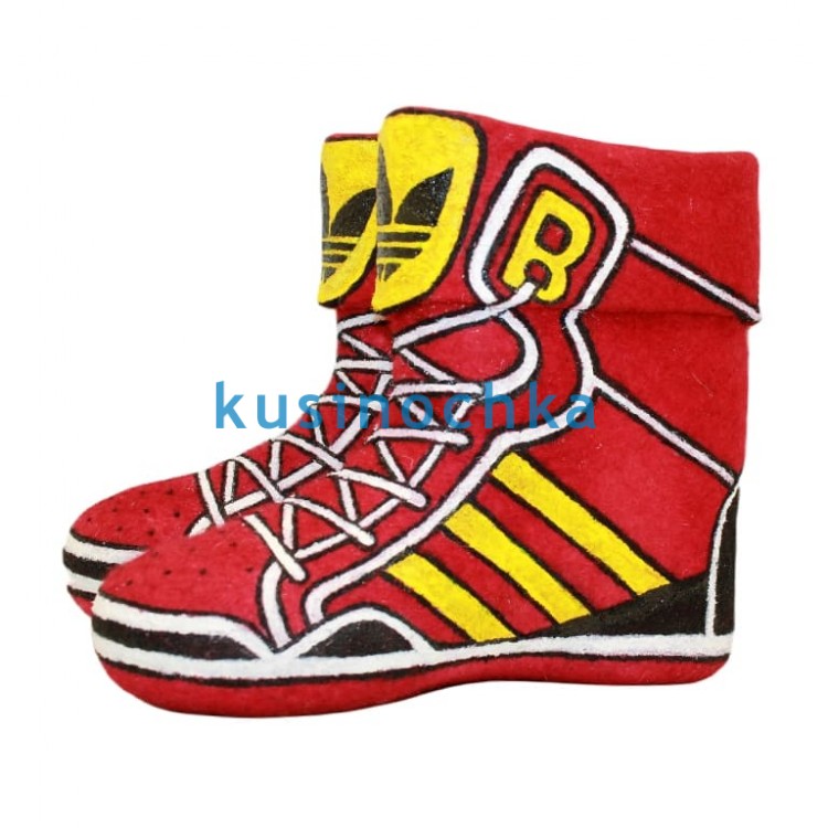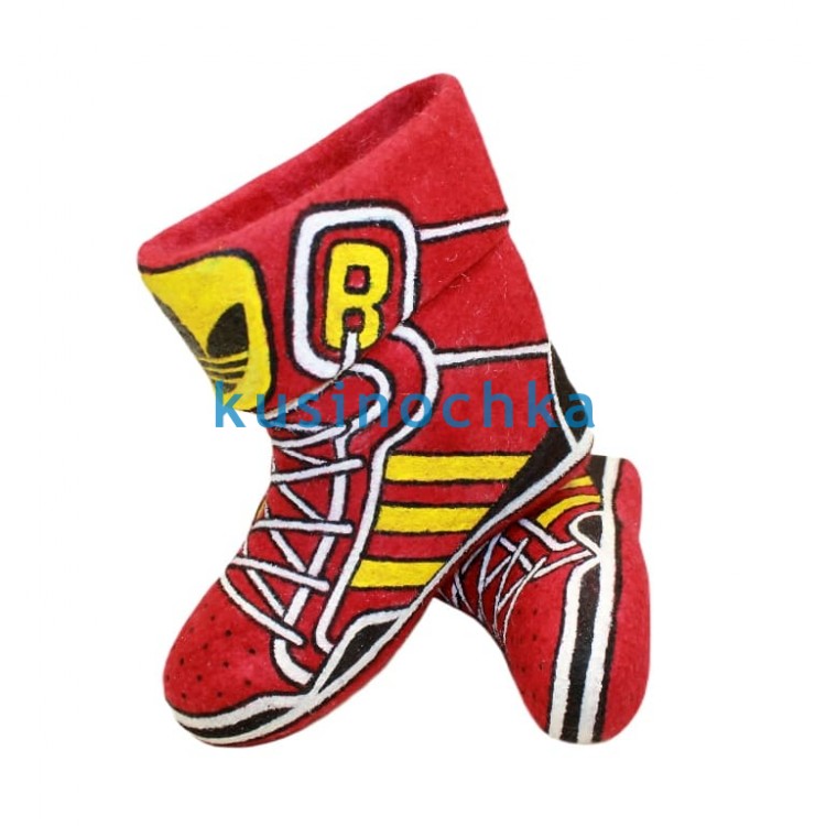 Полуваленки ручной валки на красной основе, выполненные в стиле современных кроссовок: имитация подошвы, боковых вставок и, главное — белая «шнуровка», прорисованная акриловой краской вдоль передней части. С первого взгляда — спортивная обувь; при ближайшем рассмотрении — тёплый, дышащий войлок ручной работы.