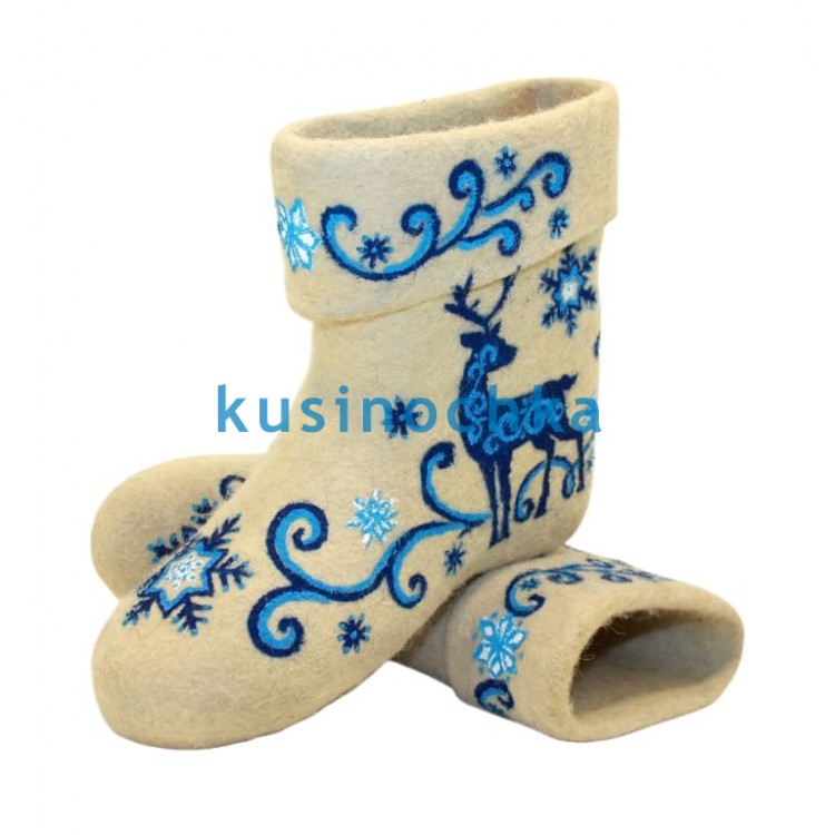 Полуваленки ручной валки на светлой основе, с декоративным узором, выполненным синей и голубой акриловыми красками. В центре композиции — олень, стилизованный, с чёткими контурами и выразительными рогами. Фоновый узор — абстрактные мотивы, напоминающие снежные завихрения, ветви или северные орнаменты, — обрамляет фигуру, не перегружая поверхность.