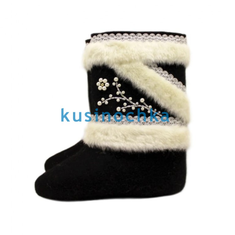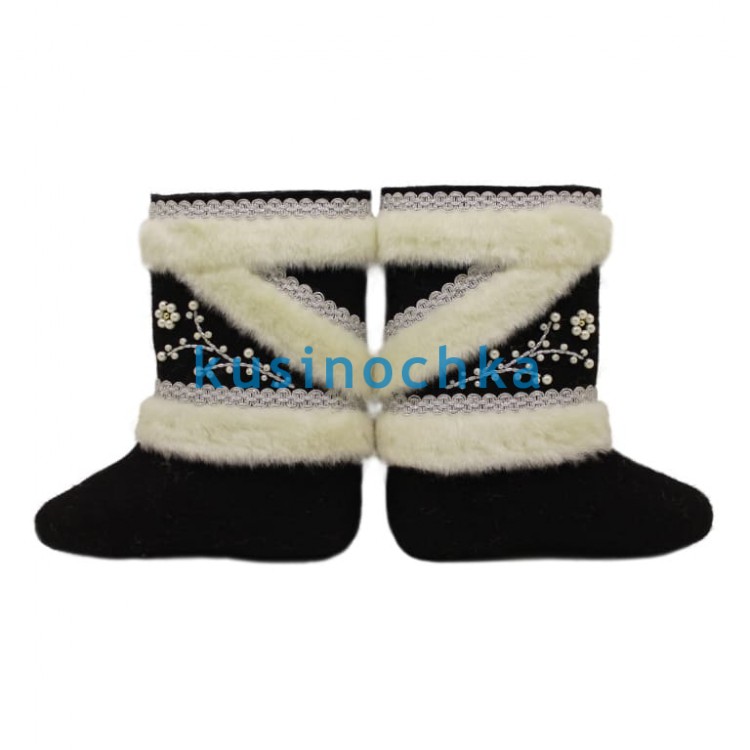 Полноразмерные валенки ручной валки на чёрной основе, с многослойной декоративной отделкой: