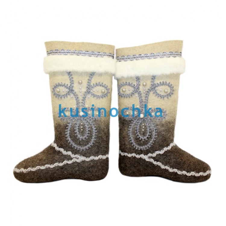 Валенки ручной валки, отделанные с особым вниманием к деталям: по верхнему краю — изысканная винтажная тесьма с геометричным узором, поверх которой — крупные стеклянные бусины (матовые, с мягким мерцанием), а по внешнему срезу отворота — объёмная опушка из натурального кроличьего меха (серо-пепельного или молочного оттенка — на выбор).