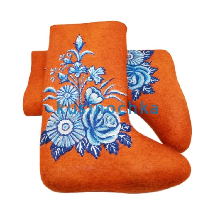 Полноразмерные валенки ручной валки на оранжевой основе, с цветочным узором в холодной гамме: синие, голубые и белые элементы переплетаются в лёгкую, стилизованную композицию — как отблеск утреннего неба на тёплом свете рассвета.