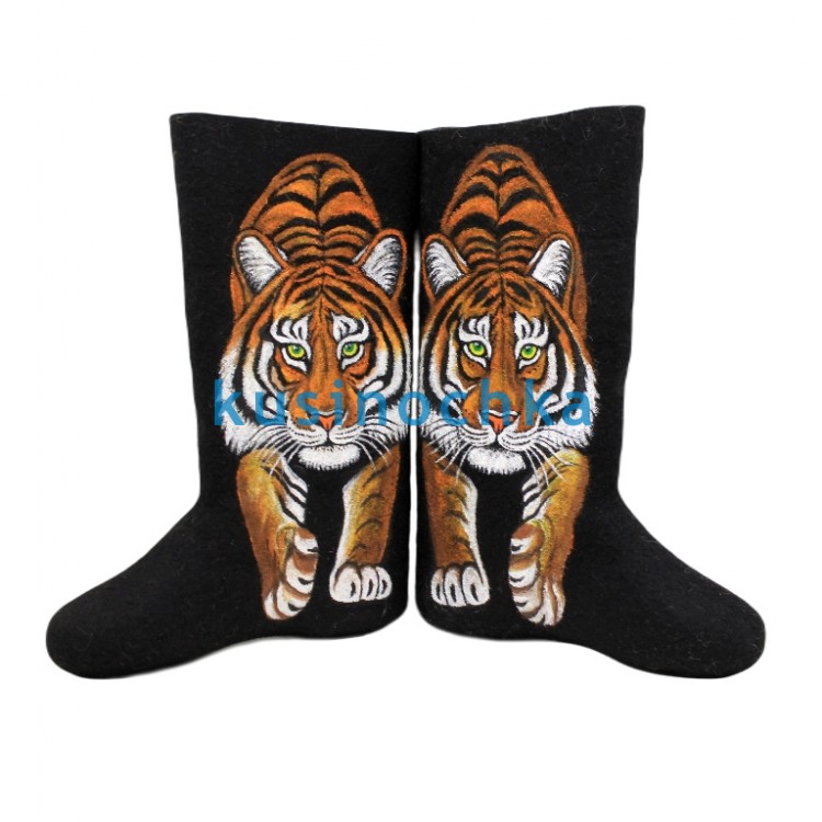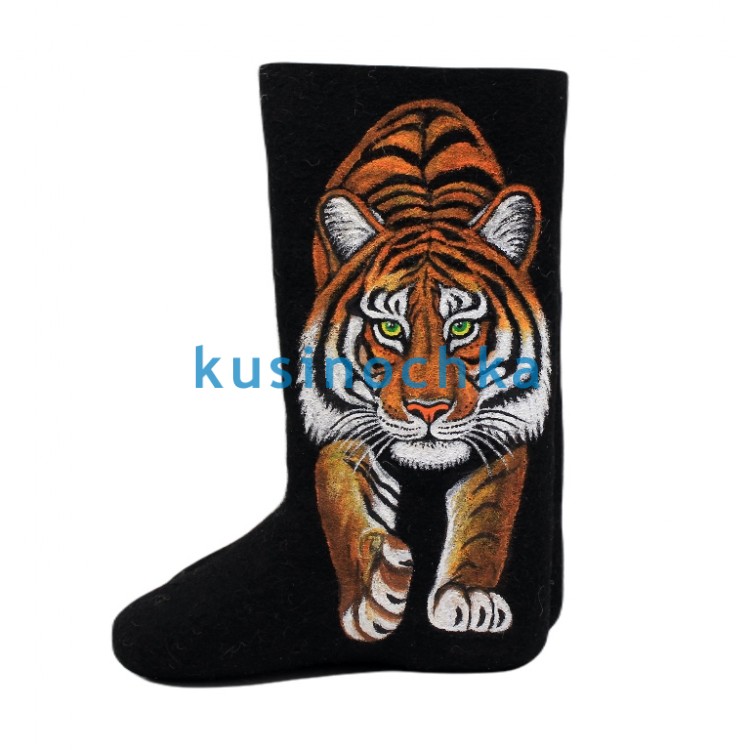 Полноразмерные валенки ручной валки на чёрной основе, с динамичным рисунком: тигр в движении — идёт вперёд, слегка пригнувшись, как в момент скрытного приближения. Полосы — чёткие, но не резкие; взгляд — сфокусированный. Фон остаётся тёмным, чтобы подчеркнуть контраст и силуэт.