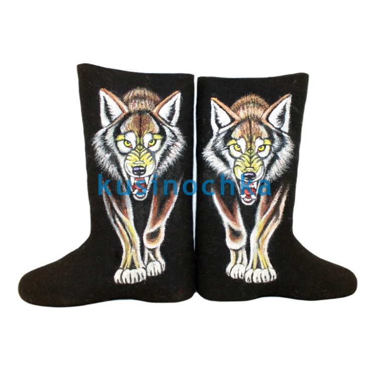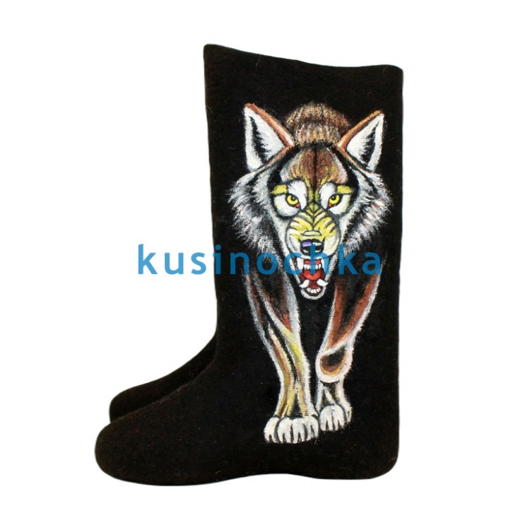 Полноразмерные валенки ручной валки на чёрной основе, с художественным рисунком: волк в фас, идущий вперёд. Образ стилизован — без агрессии, с выразительной, но спокойной мимикой: прямой взгляд, собранная поза, плавные контуры. Фон — минимален (можно оставить чистым или добавить лёгкий намёк на снег/ветви по желанию).